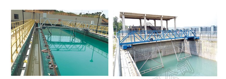 本設備由四點支撐行走大梁橫跨在平流式沉淀池上,雙邊驅動,池兩邊均鋪設鋼軌,從池的一端運行到池子的另一端,邊行走邊吸泥,撞到行程控制,折返行走,回程吸泥,完成一個工作周期。